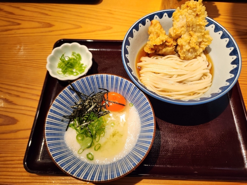 多すぎるのは分かっちゃいたけど、鶏天うどん(冷)と月見とろろごはん。